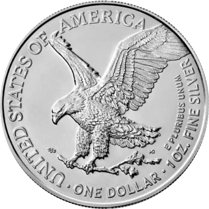 Na rewersie został przedstawiony pojedynczy Orzeł podchodzący do lądowania, niosący gałązkę dębu, jakby chciał ją dodać do gniazda. Napisy: “UNITED STATES OF AMERICA”, “E PLURIBUS UNUM”, “1 OZ. FINE SILVER” i “ONE DOLLAR”. Projektantką rewersu była Emily Damstra.