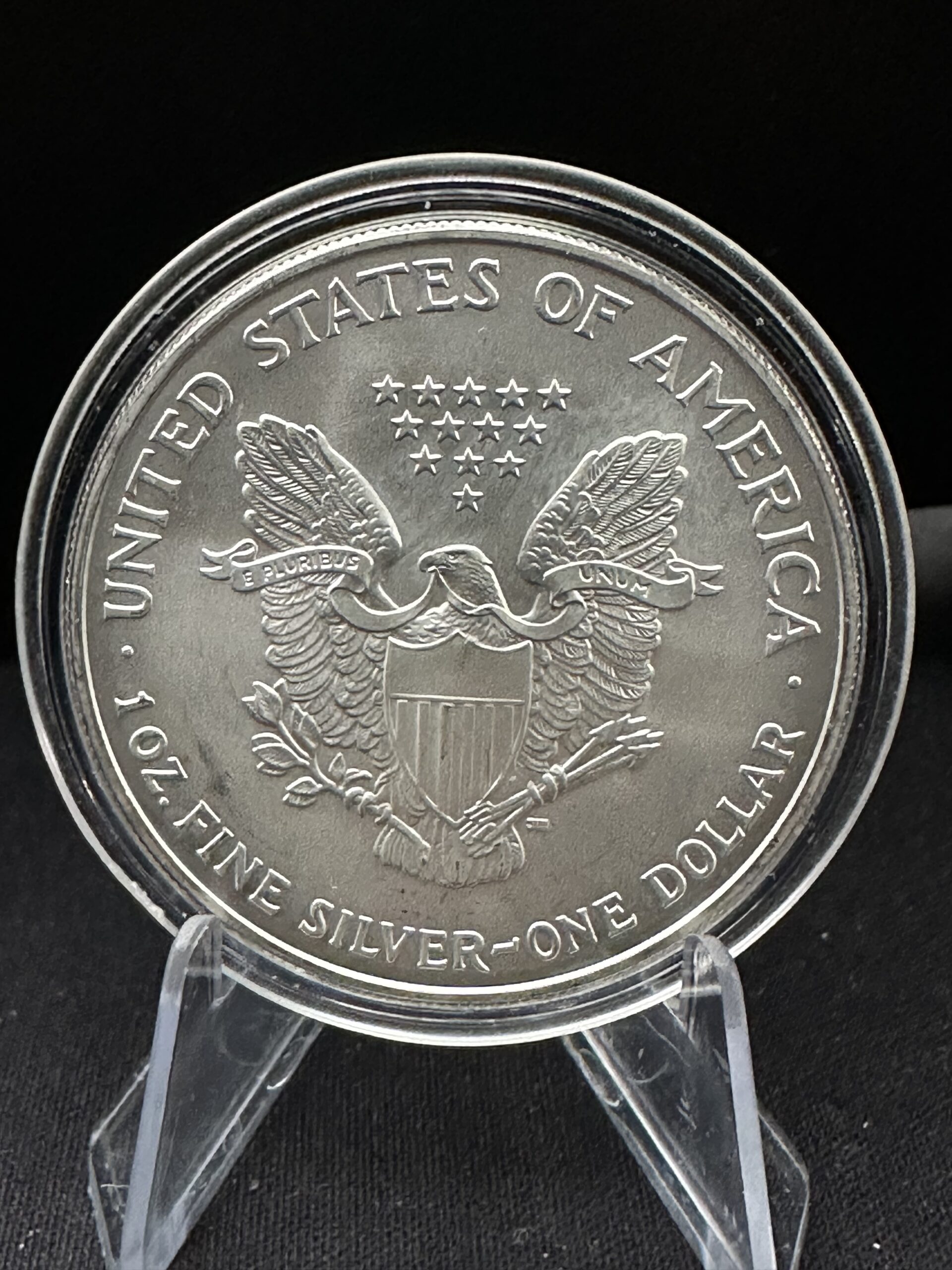 Na rewersie został przedstawiony pojedynczy Orzeł podchodzący do lądowania, niosący gałązkę dębu, jakby chciał ją dodać do gniazda. Napisy: “UNITED STATES OF AMERICA”, “E PLURIBUS UNUM”, “1 OZ. FINE SILVER” i “ONE DOLLAR”. Projektantem rewersu był John Mercanti.
