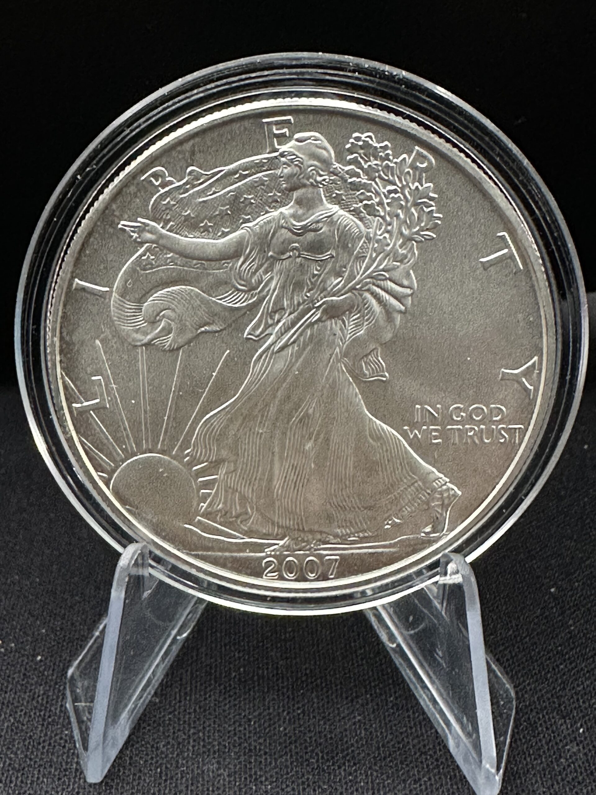 Awers przedstawia personifikację Wolności, symbol Stanów Zjednoczonych i wyzwolenia, kroczącą z atrybutami pokoju: gałązką oliwną oraz pochodnią. U jej stóp widać siedzibę Kongresu USA, a w tle promienie słońca. Awers zawiera maksymę, która została zawarta w Deklaracji Niepodległości – “In God We Trust” (Bogu Ufamy). Wizerunek monety pozostaje niezmienny od samego początku bicia srebrnych orłów – 1986r. Za projekt odpowiada Adolph Weinman.