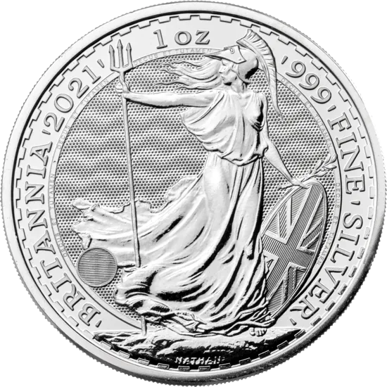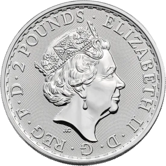 Rewers ukazuje Britannię — symbol siły, tradycji i stabilności — z tarczą, trójzębem i charakterystyczną kompozycją zaprojektowaną przez Philipa Nathana. Moneta ma średnicę 38,61 mm i nominał £2, a jej ponadczasowy charakter sprawia, że należy do najchętniej wybieranych srebrnych monet inwestycyjnych.