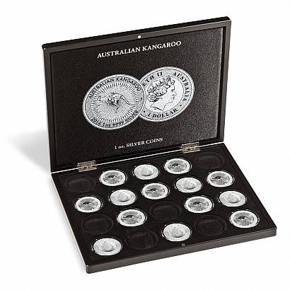 Etui Volterra to eleganckie pudełko pozwalające bezpiecznie przechowywać srebrne monety. Może pomieścić 20 monet w kapslach typu Australijski Kangur.Pudełko posiada srebrny nadruk z motywem monety oraz dyskretne zamknięcie magnetyczne.
