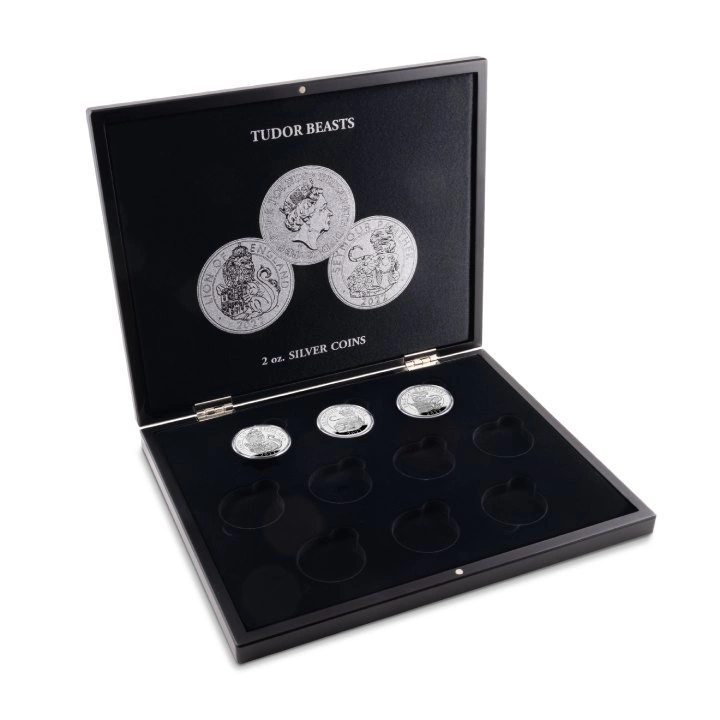 Etui Volterra to eleganckie pudełko pozwalające bezpiecznie przechowywać srebrne monety. Może pomieścić 12 monet 2oz z serii The Royal Tudor Beasts.Pudełko posiada srebrny nadruk z motywem monet oraz dyskretne zamknięcie magnetyczne.