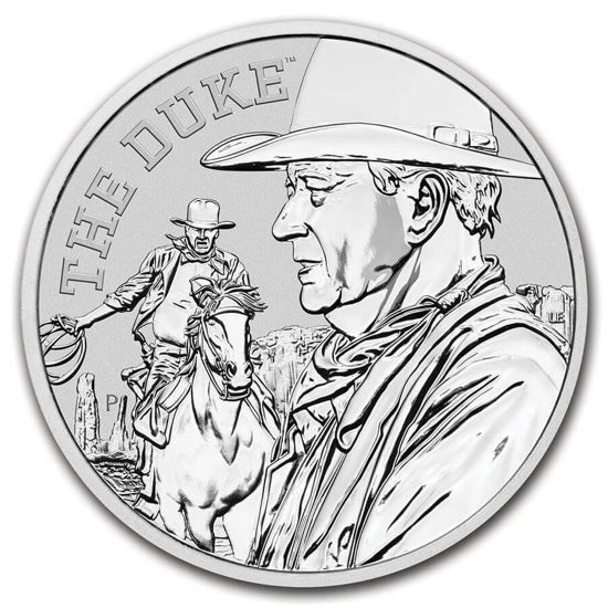 Rewers tej srebrnej monety przedstawia dwie postacie Johna Wayne’a. Na pierwszym planie widnieje jego lewy profil, natomiast w tle – na galopującym koniu, w trakcie przygotowania do rzutu lassem. Na górze umieszczono jego przydomek „The Duke”, który towarzyszył mu przez całe życie.