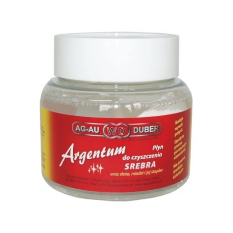 Płyn do czyszczenia Argentum srebra, złota, miedzi i jej stopów o nowoczesnej formule i kwaśnym odczynie czyści i poleruje chemicznie przedmioty poprzez ich zanurzenie lub pocieranie zwilżoną od płynu tkaniną.Płyn do wielokrotnego stosowania. Płyn nie zawiera środków ściernych. Nadaje wysoki połysk i świeży wygląd czyszczonym przedmiotom. Opóźnia proces ponownego ciemnienia. Ma szczególne zastosowanie tam, gdzie czyszczenie środkami ściernymi jest niemożliwe (np. zagłębienia) lub niewskazane.Wystarczy zanurzyć przedmiot w roztworze na kilka sekund lub przetrzeć zwilżoną tkaniną. Opakowanie z szerokim otworem przydatne do bezpośredniego zanurzania przedmiotu.Argentum 210 ml występuje w opakowaniu z plastikowym koszyczkiem wewnątrz pojemnika, ułatwiającym czyszczenie swojej biżuterii.